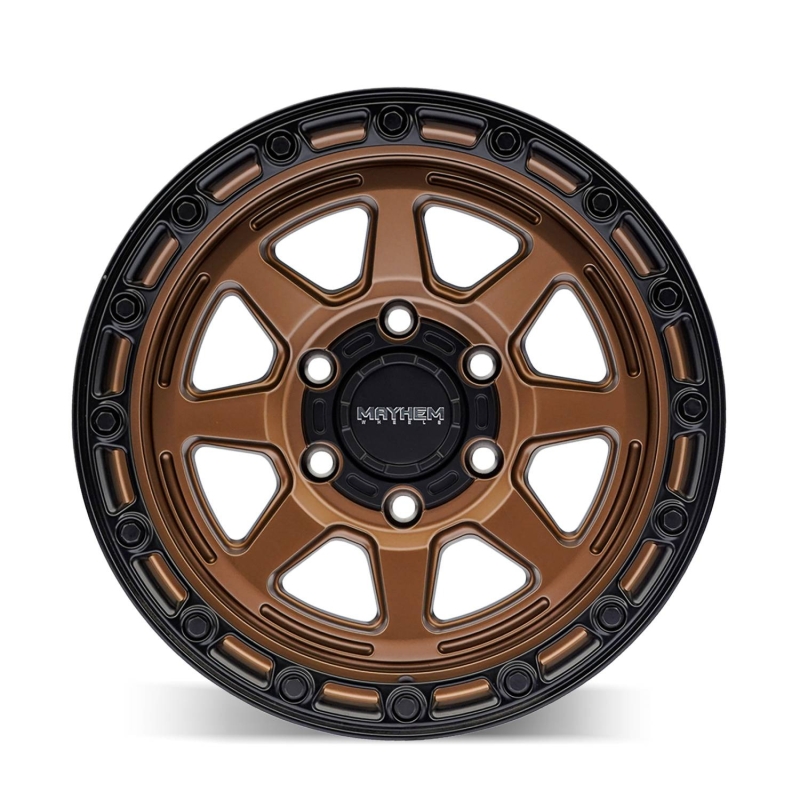 The Mayhem Ridgeline 8306 in satin bronze combines rugged performance with a bold, modern look. Designed for trucks and SUVs, this wheel’s concave profile and aggressive styling make it stand out on and off the road. The durable satin bronze finish not only adds a premium touch but also provides resistance to harsh outdoor conditions.