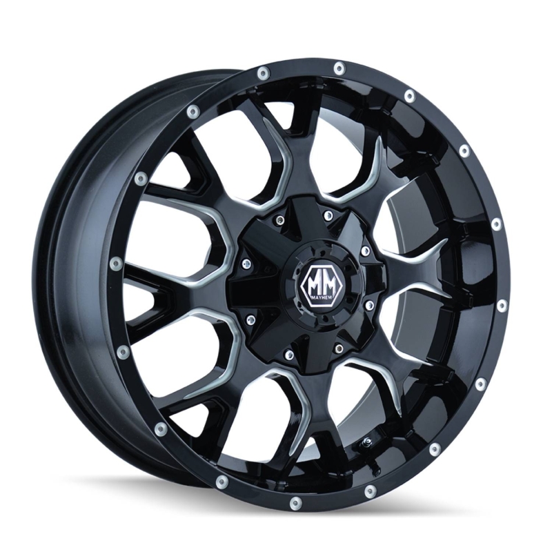 The Mayhem Warrior 8015 in gloss black milled combines aggressive styling with durable performance, making it a perfect upgrade for trucks and SUVs. Its bold split-spoke design with precision milled accents delivers a commanding stance while ensuring strength and reliability on the road or light off-road trails.